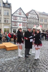 Vor den Augen zahlreicher begeisterter Zuschauer versammelten sich die fröhlichen Narren in ihren prächtigen Kostümen auf dem Marktplatz, begleitet von der festlichen Atmosphäre des Karnevals. Mit Unterstützung der Garde und unter dem energischen Jubel ihrer Anhänger setzten sie zum stürmischen Aufbruch in das Rathaus an. „Ergib dich Paule, ohne großes Gemaule. Oder glaubst du du kannst hier überwintern. Wir machen dir gleich Feuer unterm Hintern“