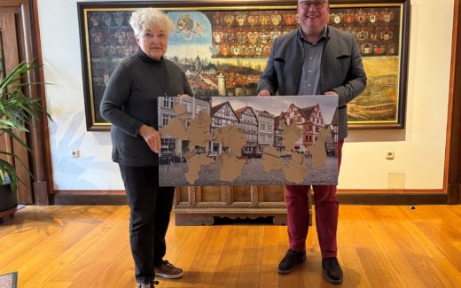 Kürzlich wechselte im Rahmen eines Besuchs ein einzigartiges Geschenk im Alsfelder Rathaus den Besitzer. Die in Romrod lebende Garance Pabst übergab Bürgermeister Stephan Paule ein Bild mit dem Titel „Alsfelder Small Talk“.
