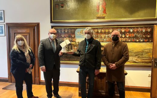 Im Bild vlnr: Stabstellenleitung Soziales u. Kultur Nicole Jörg, Bürgermeister Stephan Paule, ehemaliger Leiter des Beratungszentrums Vogelsberg Matthias Gold und neuer Leiter des Beratungszentrums Vogelsberg Peter Pfeiffer.