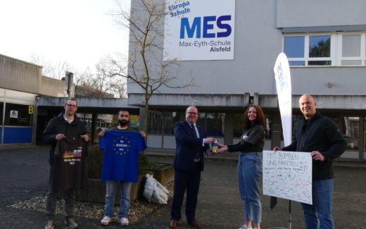 Die Schülervertretung (SV) der MES Alsfeld führte in den letzten Wochen eine Spendenaktion an ihrer Schule für die Opfer des Krieges in der Ukraine durch. Die Spenden sollen der Flüchtlingsarbeit der Alsfelder Partnerstadt Spisska Nova Ves in der Slowakei zugutekommen. Die Schulsprecherin Lynn Gröger und ihr Stellvertreter Hasan Mert Kaplan übergaben zusammen mit den Verbindungslehrern Mario Hill und Andreas Loll die Spenden in Höhe von 530 € an Bürgermeister Stephan Paule, den Vorsitzenden des Städtepartnerschaftsvereins Alsfeld e.V.